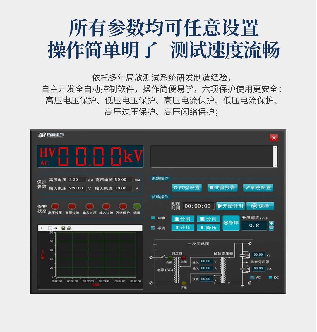 6、所有測試參數可提前進行設置,能達到高壓電壓放電擊穿電壓準確記憶、儲存、復位一系列功能;自動掃描時間設定,自動存儲電老化過程中的時間、電壓、電流等詳細記錄,方便用戶查看;