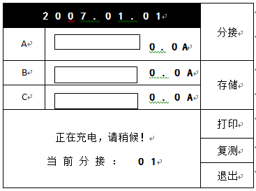 選擇好測(cè)量電流,接好三相接線,在初始界面狀態(tài)下按“測(cè)量”鍵后,直阻儀進(jìn)入測(cè)量狀態(tài),開(kāi)始給繞組供電。并進(jìn)入如下界面: