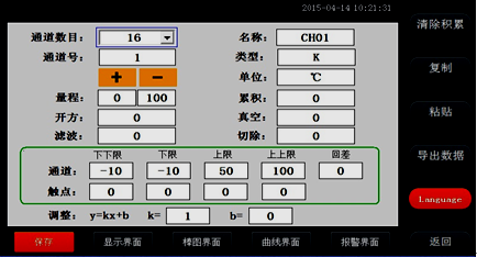 調(diào)整:對(duì)通道值的修正調(diào)整,使其顯示理想的數(shù)值。通過(guò)調(diào)整k值來(lái)調(diào)整溫度的倍數(shù)(乘除),調(diào)整b值可以調(diào)整數(shù)值的正負(fù)值的大小。