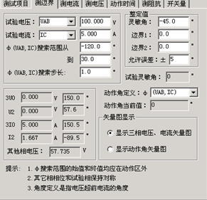 微機繼電保護測試儀的測邊界作者:合眾電氣發布時間:2021-08-16瀏覽量:3809 次字體顯示:【大】【中】【小】 微機繼電保護測試儀的測邊界。 測邊界 自動測試出方向性保護的兩個動作邊界,并且自動計算出最大靈敏角。在“顯示動作角矢量圖”的顯示方式下,從主界面右側的圖中可以很直觀地觀察到兩條邊界線和最大靈敏線。上一篇: 微機繼電保護測試儀試驗參量下一篇: 微機繼電保護測試儀測試項目的界面說明