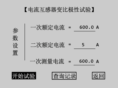 在互感器綜合特性測(cè)試儀CT測(cè)試主界面上轉(zhuǎn)動(dòng)旋轉(zhuǎn)鼠標(biāo),選擇變比極性試驗(yàn),按下旋轉(zhuǎn)鼠標(biāo)則進(jìn)入圖3.18所示的CT變比極性試驗(yàn)參數(shù)設(shè)置界面。
